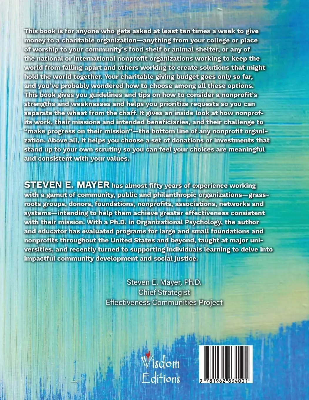 Congratulations for distilling the wisdom you’ve gained from a life of activism with a study of practices and strategies that make for effective nonprofits. You’ve created a compact, crisply written guidebook with tools and tips we donors can use-and nonprofits can look to as well-and reminded us of the values of honesty, trust, empathy, humility, respect, and dignity we must cultivate in our collective efforts to make the world a better place.