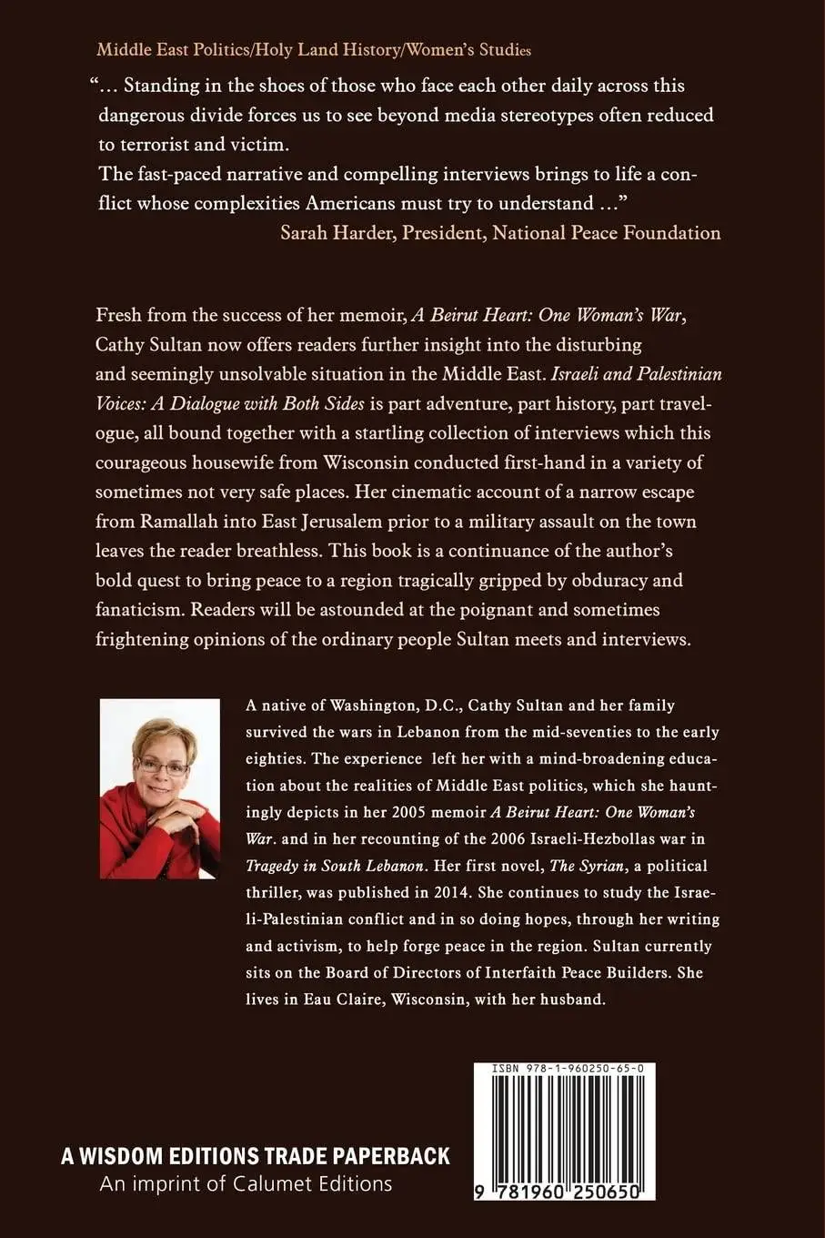 After the award-winning success of her memoir, A Beirut Heart: One Woman’s War, Cathy Sultan offers readers further insight into the seemingly unsolvable situation in the Middle East. Israeli and Palestinian Voices: A Dialogue with Both Sides is part adventure, part history, part travelogue, all bound together with a startling collection of interviews which this courageous housewife from Wisconsin conducted personally in a variety of sometimes very unsafe places. Her cinematic account of a narrow escape from Ramallah into East Jerusalem prior to a military assault on the town leaves the reader breathless. This book is a continuation of the author’s bold quest to bring peace to a region tragically gripped by obduracy and fanaticism. Readers will be astounded at the poignant and sometimes frightening opinions of the ordinary people Sultan meets and interviews.