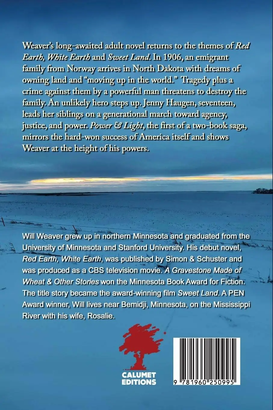 Weaver’s long-awaited adult novel returns to the themes of Red Earth, White Earth and Sweet Land. In 1906, an emigrant family from Norway arrives in North Dakota with dreams of owning land and “moving up in the world.” Tragedy plus a crime against them by a powerful man threatens to destroy the family. An unlikely hero steps up. Jenny Haugen, seventeen, leads her siblings on a generational march toward agency, justice, and power. Power & Light, the first of a two-book saga, mirrors the hard-won success of America itself and shows Weaver at the height of his powers.