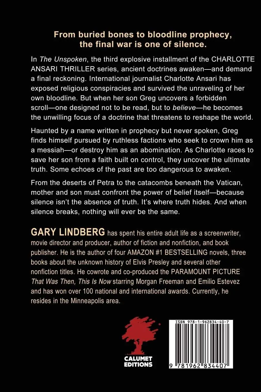 In The Unspoken, the third explosive installment of the CHARLOTTE ANSARI THRILLER series, ancient doctrines awaken—and demand a final reckoning. International journalist Charlotte Ansari has exposed religious conspiracies and survived the unraveling of her own bloodline. But when her son Greg uncovers a forbidden scroll—one designed not to be read, but to believe—he becomes the unwilling focus of a doctrine that threatens to reshape the world.